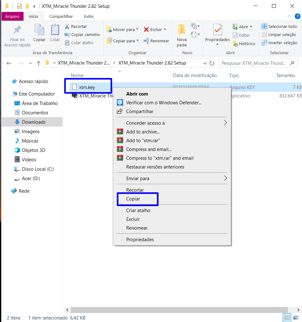 Depois que concluir a instalação precisamos fazer a ativação do programa antes de utilizarmos, portanto NÃO ABRA O PROGRAMA. Volte na pasta que você executou o programa e copie o arquivo xtm.key clicando com o botão direito do mouse em cima do arquivo e clicando em Copiar.
