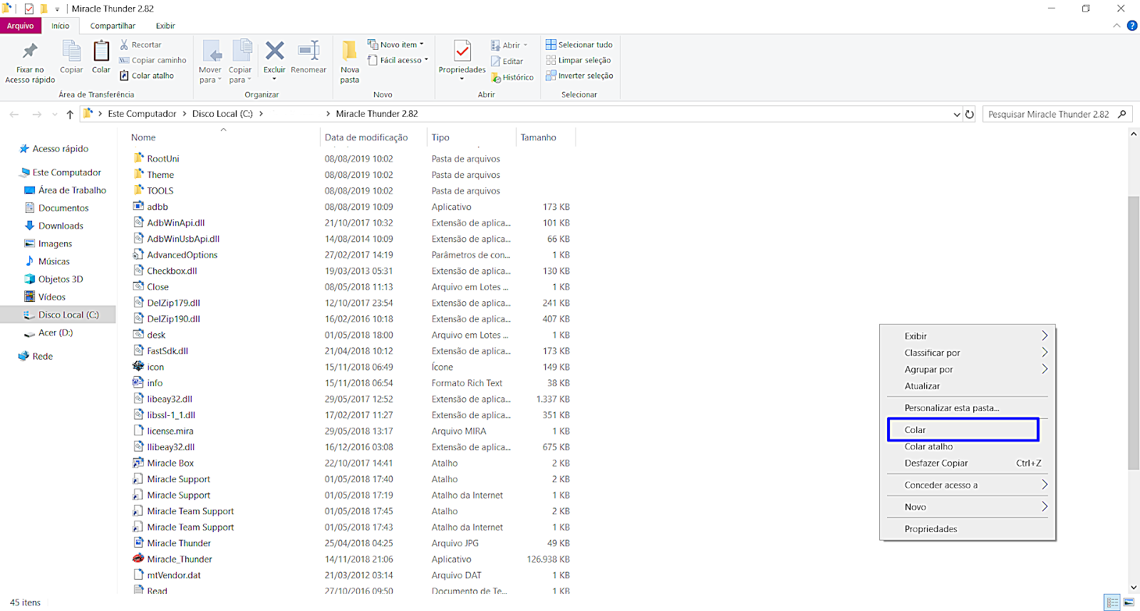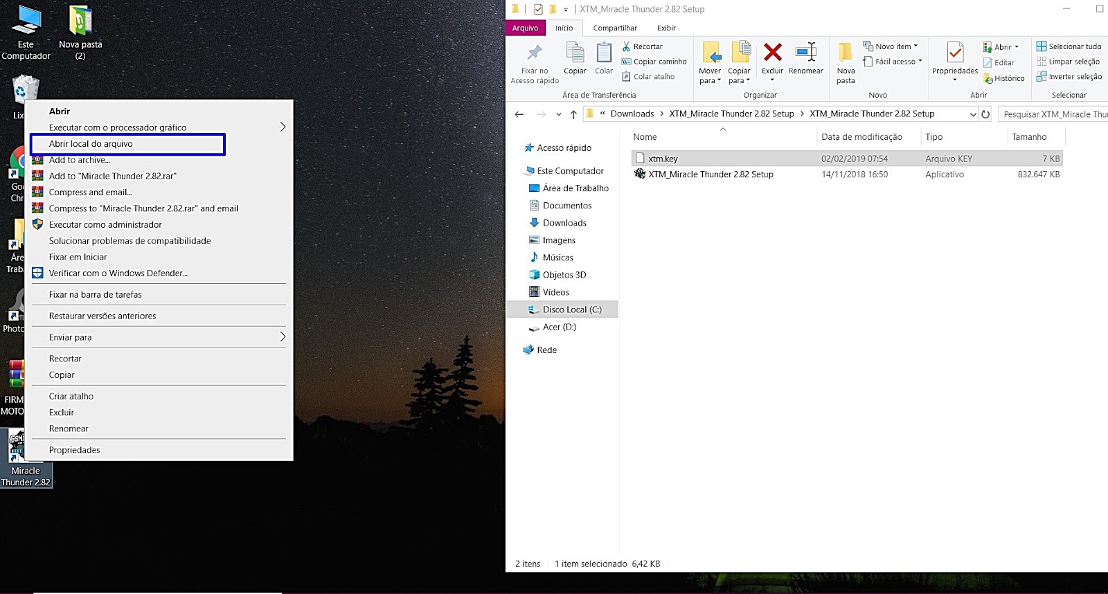 Copiou o arquivo xtm.key, vai na sua área de trabalho e toca com o botão direito do seu mouse em cima do aplicativo Miracle Thunder 2.82 e clica na opção Abrir Local do Arquivo.