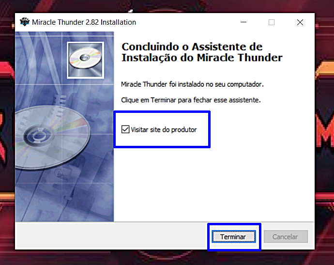 Depois que finalizar vai apresentar a tela abaixo, desmarca a opção de Visitar site do Produtor e clique em Terminar.