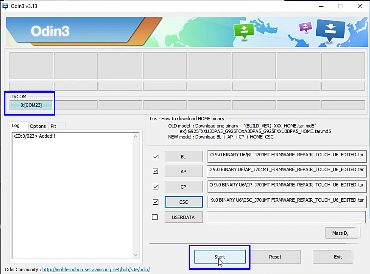 Agora conecte o cabo usb no celular, confira se o Odin reconheceu o celular no computador e clica em START.