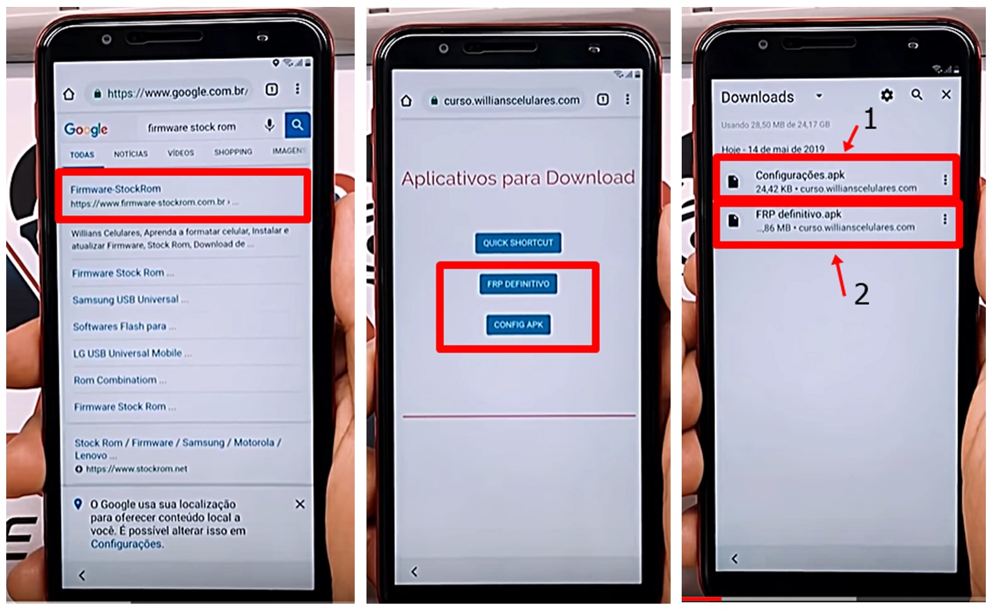 Entrou no site da Firmware Stockrom rola a pagina até o final e clica na imagem de um ROBOZINHO do ANDROID escrito FRP BYPASS, Vai abrir outra pagina e nela vai ter varios arquivos, mas você só vai precisar de 2, o FRP Definitivo e o Config APK, clica nos dois e permita o download. Quando finalizar o download você pode ir nos 3 pontinhos do canto direito da tela e clicar em Download, Pronto os arquivos necessários já estão no seu celular.