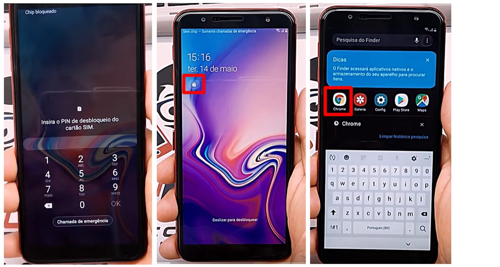 Com o chip já bloqueado coloca no aparelho que esta tentando desbloquear a conta e assim que aparecer a tela pedindo a senha do chip, remove o chip novamente, Você vai perceber que vai aparecer um cadeado no canto da tela, puxa ele para o centro, assim que puxar vai aparecer a barra de notificação , clica na lupa bem no topo da tela e depois clica em Chrome. Bom agora já é metade do processo concluído.